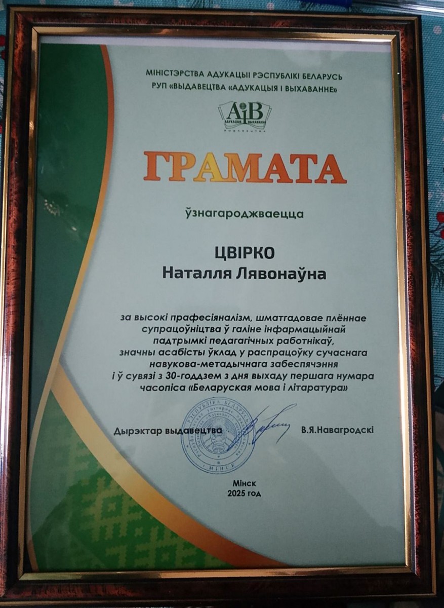 МІНСК. Урачыстае мерапрыемства, прысвечанае 30-годдзю з дня выхаду першага нумара часопіса «Беларуская мова і літаратура», адбылося 12 снежня ў выдавецтве «Адукацыя і выхаванне». Сярод удзельнікаў урачыстасці – член Саюза пісьменнікаў Беларусі, паэтэса, педагог Наталля Цвірко (Шчучынскі раён).